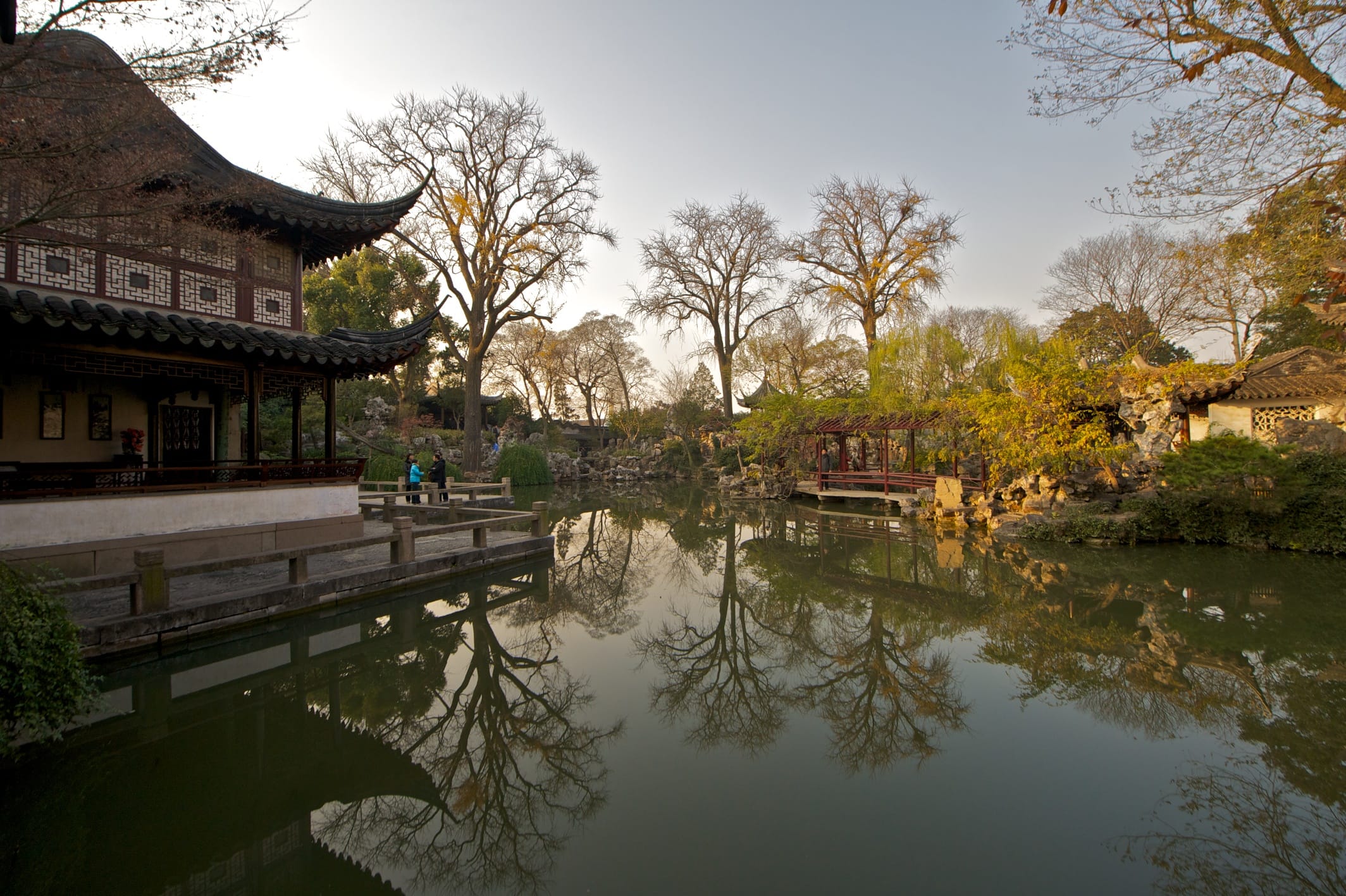 The garden’s sole walkable bridge, and a rare covered corridor bridge in Jiangnan garden design. Vermilion railings create striking reflections.