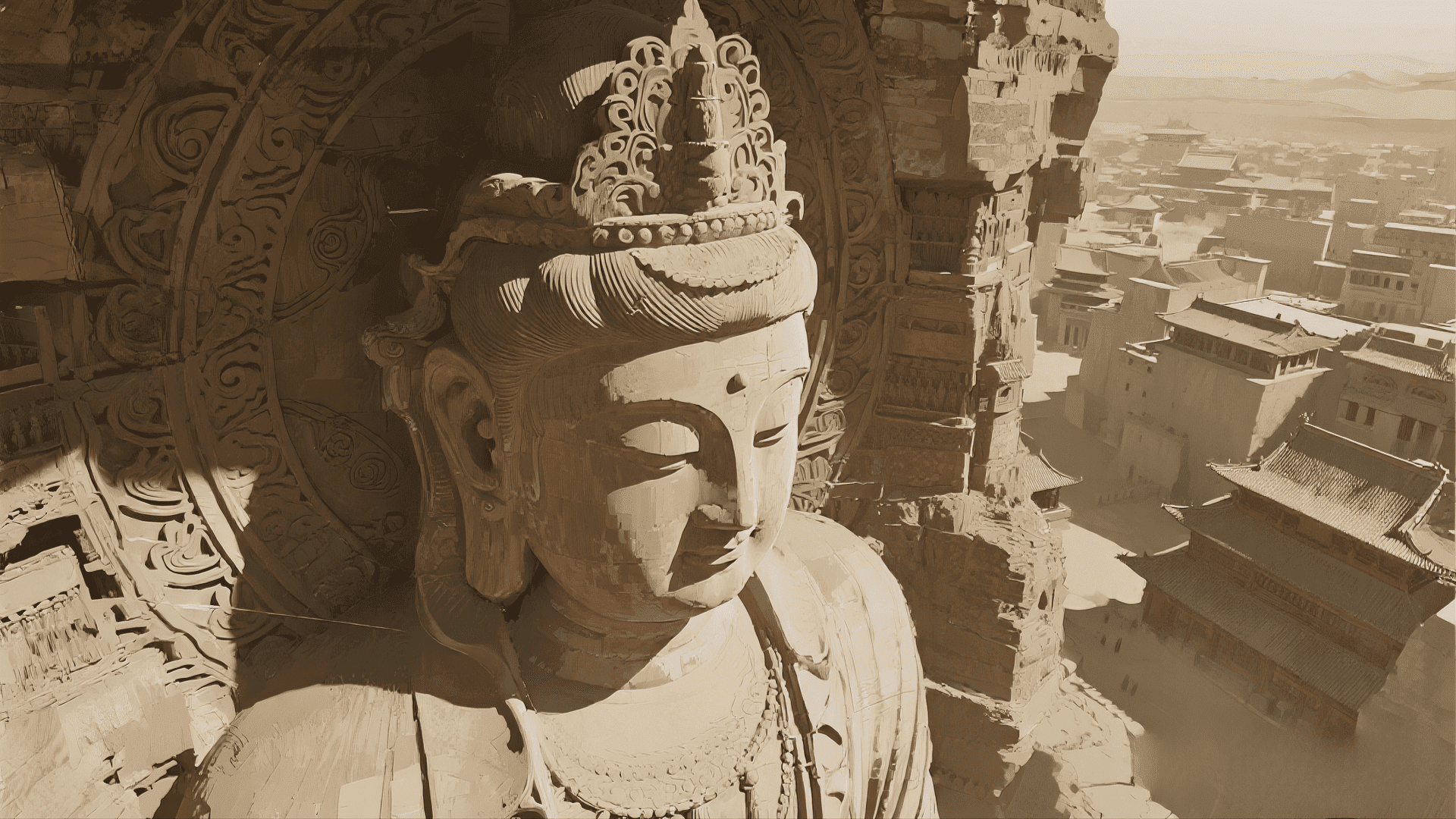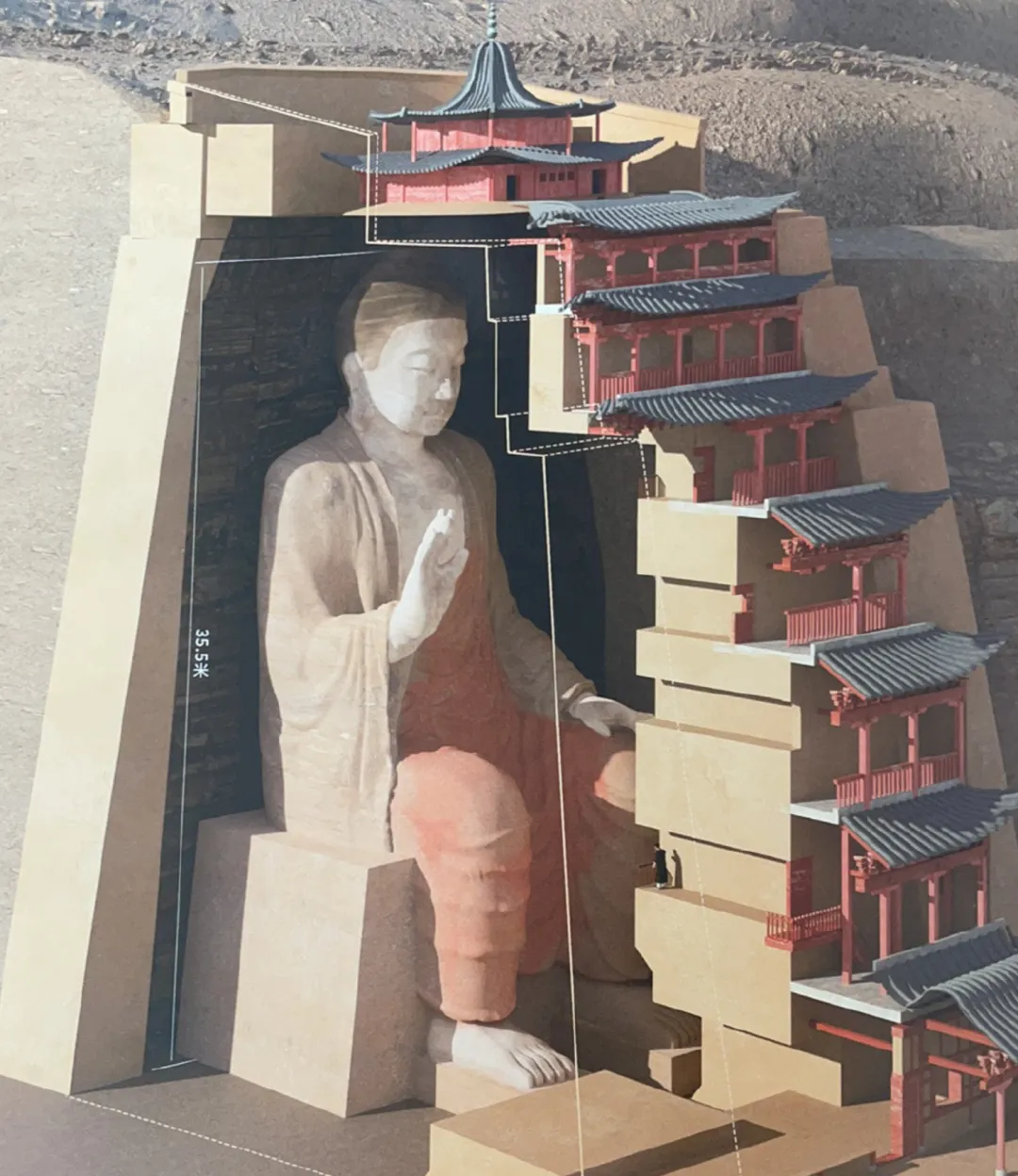 Dunhuang’s Nine-Story Building (Jiucenglou) is the only surviving intact example of what these facades looked like — built to shelter the 35.5-meter Maitreya Buddha in Cave 96. Stand in front of it and you understand what the other grottoes used to look like: not ruins open to sky, but the innermost sanctuary of a complete temple complex whose exterior shell is gone.